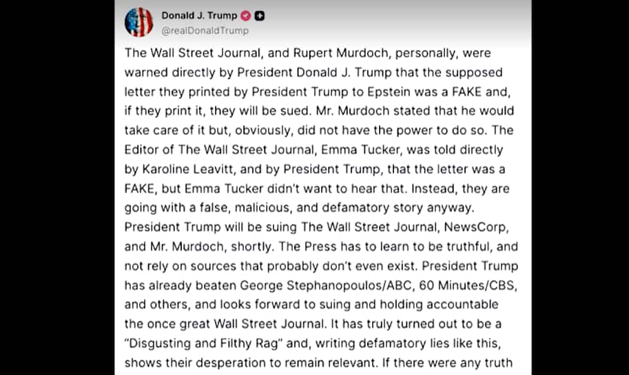 Trump ha negato categoricamente ogni coinvolgimento, definendo la lettera "un falso" e avvia una causa legale contro il Wall Street Journal, la società editrice News Corp e il suo proprietario Rupert Murdoch. "Non ho mai scritto quella lettera, non è la mia lingua, non sono le mie parole", ha dichiarato su Truth, accusando il giornale di diffondere notizie false e diffamatorie. Lo scontro arriva in un momento delicato per i repubblicani, con crescenti critiche per la gestione ritenuta troppo sbrigativa del caso Epstein da parte dell'ex ministra della Giustizia Pam Bondi. In risposta alla crescente pressione, Trump ha infine chiesto la divulgazione completa dei file sul caso Epstein, sostenendo: "Questa truffa, perpetuata dai Democratici, dovrebbe finire, subito!"