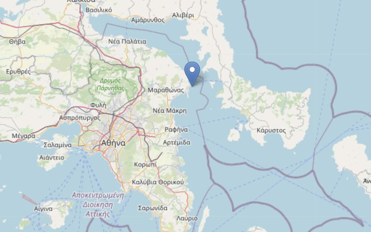 Il sisma è stato registrato alle ore 00:27 (le 23:27 di ieri in Italia) al largo dell'isola greca di Eubea. L'ipocentro è a meno di 15 km di profondità e l'epicentro non lontano dalla città di Nea Styra. Al momento non sono segnalati danni o feriti