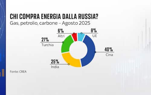 - A chi sta vendendo gas, petrolio e carbone la Russia oggi? Ad agosto 2025 l’Unione europea assorbiva l’8% delle vendite, mentre Cina e India contavano rispettivamente per il 40% e il 25% del mercato. Da segnalare poi la quota della Turchia, che è parte della Nato, che acquista il 21% delle materie prime energetiche provenienti da Mosca
