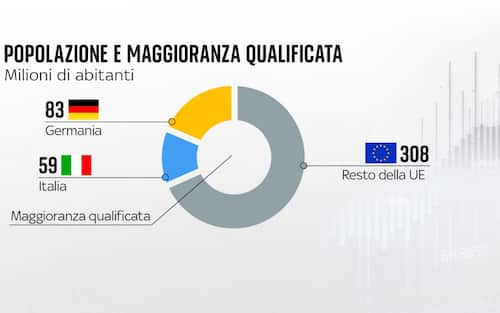 - La maggioranza qualificata, per temi come quello delle sanzioni economiche, è raggiunta quando votano a favore almeno 15 Paesi Ue che insieme rappresentano almeno il 65% della popolazione europea. Questo mette pressioni sugli Stati con più abitanti, come Germania e Italia, rispettivamente il primo e il terzo Paese più popolosi dell'Unione