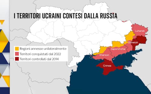- Trump ha specificato che il riferimento è ai territori che Kiev controllava prima della guerra, quindi escluse la Crimea e le zone del Lugansk e del Donetsk, controllate dai russi dal 2014. Il presidente Usa parla dei territori che nella cartina sono evidenziati in rosso chiaro e oggi sono stati conquistati da Mosca ma che, secondo il tycoon, l'Ucraina potrebbe riprendersi. Vengono meno quindi le pretese russe su quei territori in giallo che Mosca ha annesso e su cui si era aperto quel possibile scambio di territori di cui si è parlato ad agosto