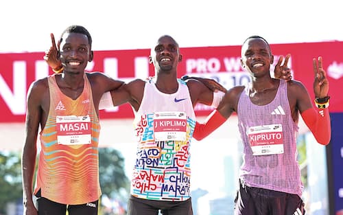 - Il 25enne Kiplimo (in foto, al centro) aveva ottenuto ottimi risultati in pista (bronzo olimpico ad Atene nei 10mila e bronzo sulla stessa distanza al mondiale 2022) prima di passare alla strada. Dopo aver stabilito il record mondiale di mezza maratona (56m42s) lo scorso febbraio a Barcellona, l'ugandese era arrivato secondo nella sua prima maratona, a Londra ad aprile. Il keniano Amos Kipruto è arrivato secondo (2h03m54s) (in foto, a destra) davanti al connazionale Alex Masai (2h04m37s) (in foto, a sinistra)