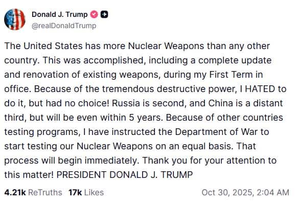 In un post pubblicato su Truth da Gyeongju, in Corea del Sud, prima del suo incontro con il leader cinese Xi Jinping, il tycoon ha scritto: "Dal momento che altri Paesi hanno programmi per testare (le armi), ho dato istruzioni al dipartimento della Guerra perché testino le nostre armi nucleari su eguali basi. Questo processo inizierà immediatamente"