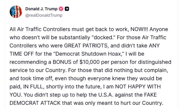 Donald Trump ha ordinato a tutti i controllori del traffico aereo di "tornare al lavoro subito!" minacciando chiunque non lo faccia di subire una "decurtazione" sostanziale del proprio stipendio. Il presidente americano lo ha scritto in un post su Truth, annunciando inoltre che per tutti i controllori di volo che "sono stati grandi patrioti e non si sono presi nessun giorno di permesso durante la 'finta chiusura del Governo dei Democratici'" raccomanderà un bonus di 10.000 dollari. Critiche sono state rivolte, invece, a coloro che "non hanno fatto altro che lamentarsi", persone che sono state invitate, se vogliono "a lasciare il servizio nel prossimo futuro" e a farlo ma "senza alcun pagamento o indennità di fine servizio".