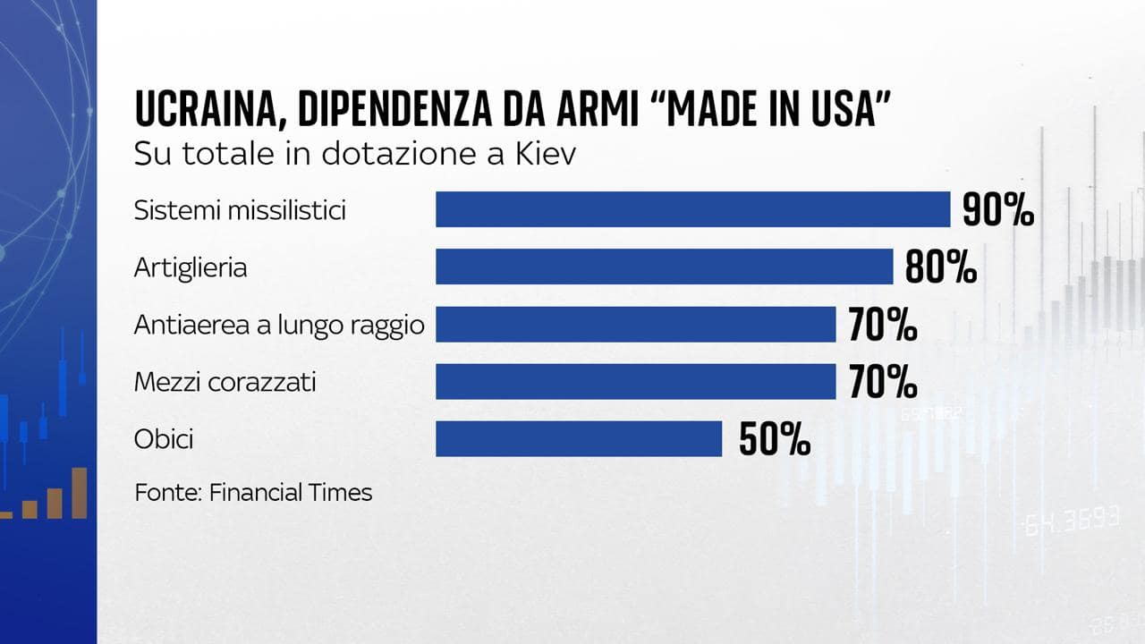 Era il 15 febbraio 2025 quando il presidente dell'Ucraina Volodymyr Zelensky aveva pubblicamente ammesso che, "senza le armi americane", Kiev aveva "possibilità di sopravvivenza molto basse". A distanza di oltre 9 mesi, la situazione - secondo i dati in possesso del Financial Times - sembra non essere cambiata. Di questo si è parlato nella puntata di Numeri di Sky TG24, andata in onda venerdì 21 novembre.