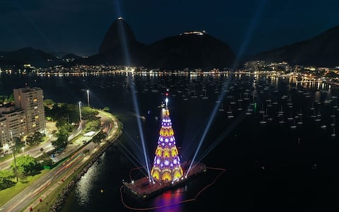 - Vista aerea dell'albero di Natale galleggiante sulla spiaggia di Botafogo con il monte Pan di Zucchero sullo sfondo a Rio de Janeiro