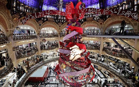 - All'interno del noto centro commerciale parigino Lafayette, viene allestito un albero spettacolare ogni anno, spesso caratterizzato da un design artistico e opulento. L'albero del 2025 è stato firmato dall'illustratrice Jeanne Detallante e decorato con chilometri di luci LED, nastri e tessuti scintillanti