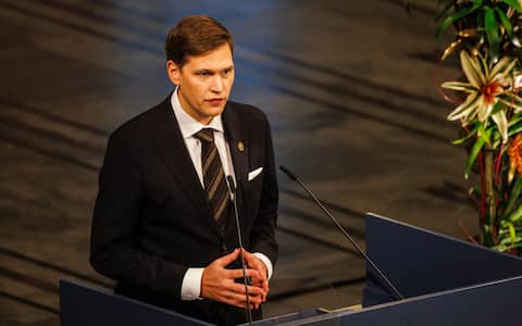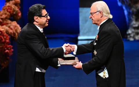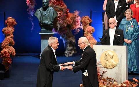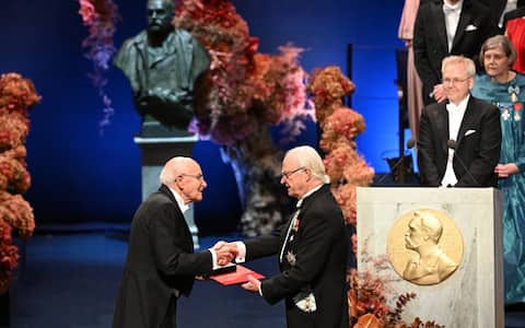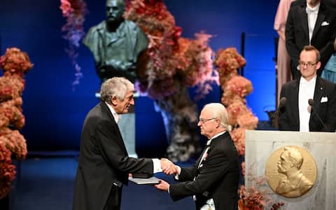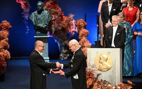 - Sono stati inoltre consegnati, nel corso della cerimonia a Stoccolma, i Premi Nobel per l’Economia del 2025: in foto il re di Svezia Carlo XVI Gustavo premia l’economista francese Philippe Aghion.