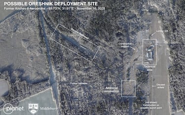 Putin in un incontro del dicembre 2024 con la sua controparte bielorussa, Alexander Lukashenko, aveva detto che l'Oreshnik sarebbe stato posizionato in Bielorussia nella seconda metà del 2025 come parte di una strategia rivista in cui Mosca prevede la dislocazione di armi nucleari fuori dal suo territorio per la prima volta dalla Guerra Fredda. Lukashenko la scorsa settimana ha detto che i primi missili erano stati schierati senza menzionare una posizione. Ma ha aggiunto che fino a 10 Oreshnik saranno stanziati nel Paese. I ricercatori americani hanno valutato che il sito è abbastanza grande da ospitare solo tre lanciatori e che altri potrebbero essere dislocati in un'altra posizione.