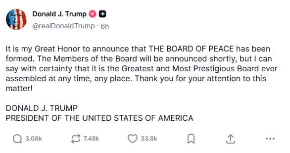"E' per me un grande onore annunciare che il board della pace" per Gaza "è stato formato: i membri del board saranno annunciati a breve, ma posso dire che con certezza che si tratta del Consiglio più grande e prestigioso mai messo insieme in qualsiasi momento e in qualsiasi luogo". Lo ha riferito, in un post pubblicato su Truth, Donald Trump, dopo che alcune ore prima era stato annunciato anche l'avvio della fase 2 del suo piano per Gaza.