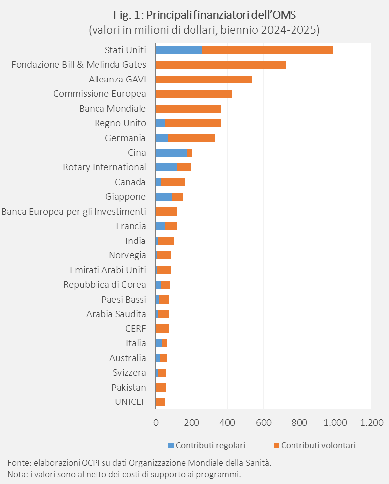 - Impatto economico. Oltre il 75% del budget biennale proviene da finanziamenti volontari versati dagli Stati membri e da numerosi attori non statali, come fondazioni filantropiche e altre istituzioni internazionali (tra cui l’UE). Gli Usa sono storicamente i principali finanziatori dell’Oms: contribuiscono al 15% circa del budget complessivo annuo e cioè finanziano l’ente per circa 400-500 milioni l’anno.