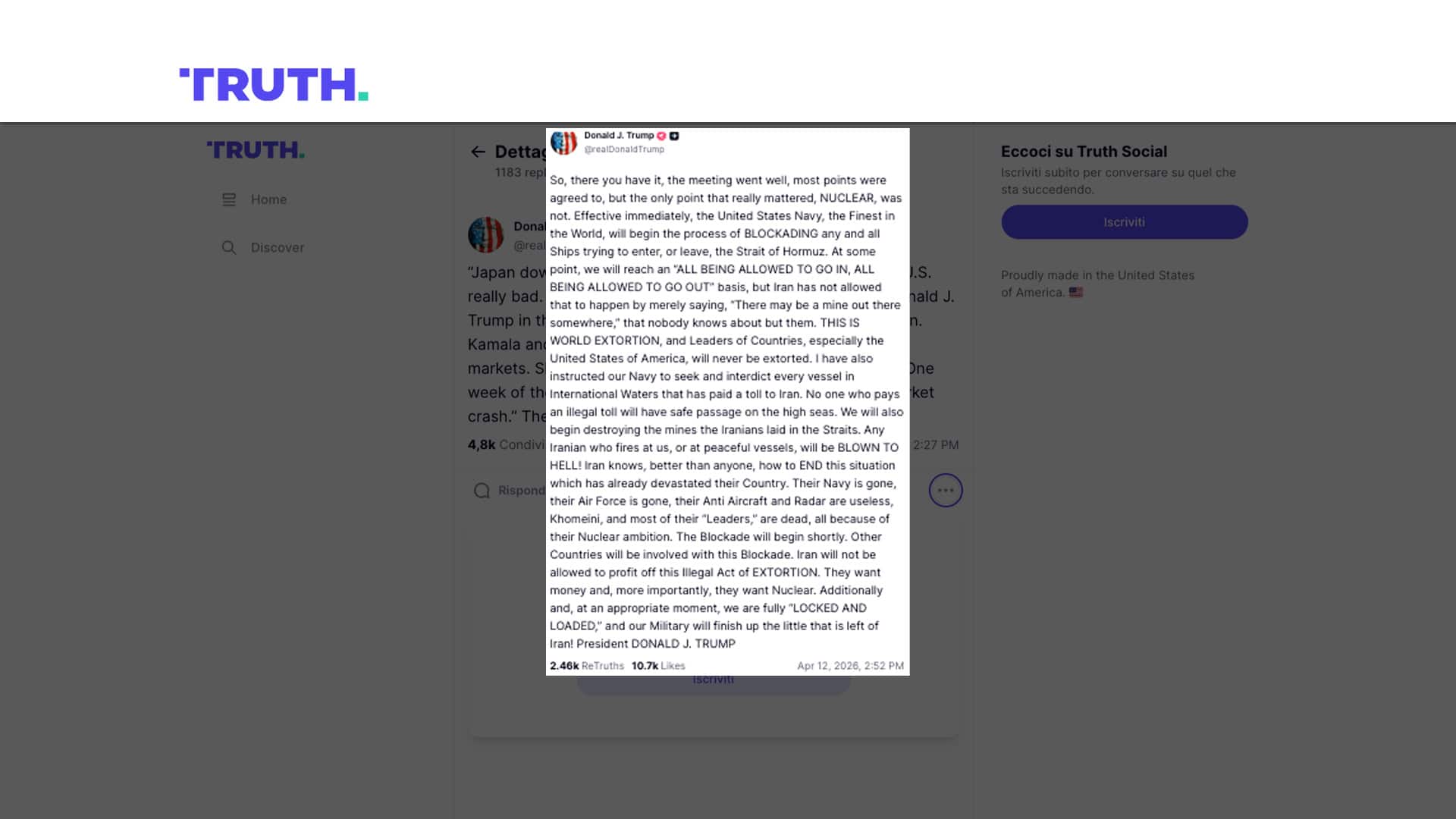 Nella giornata dell’11 aprile, Trump aveva confermato l’invio di due cacciatorpedinieri americani per sminare l’area dello Stretto, ora su Truth torna a parlarne per annunciare il blocco "con effetto immediato" di tutte le navi da e per Hormuz dopo il fallimento dei negoziati, minacciando tanto i Paesi che dovessero mandare le loro petroliere nella zona quanto l’Iran: "Inizieremo a distruggere le mine che gli iraniani hanno posato nello Stretto. Qualsiasi iraniano che spari contro di noi o contro imbarcazioni pacifiche verrà fatto saltare in aria!", ha scritto il presidente Usa su Truth ribadendo la fortissima opposizione all’ipotesi che Teheran faccia pagare un pedaggio per consentire il passaggio per lo Stretto: "Ho ordinato alla nostra Marina di individuare e intercettare ogni imbarcazione nelle acque internazionali che abbia versato un pedaggio all'Iran – ha avvisato Trump -. Nessuno che paghi un pedaggio illegale avrà libero transito in mare". Più tardi, in un'intervista a Fox, Trump ha aggiunto che anche "la Gran Bretagna e un paio di altri Paesi stanno inviando dei dragamine", nello stretto di Hormuz.
