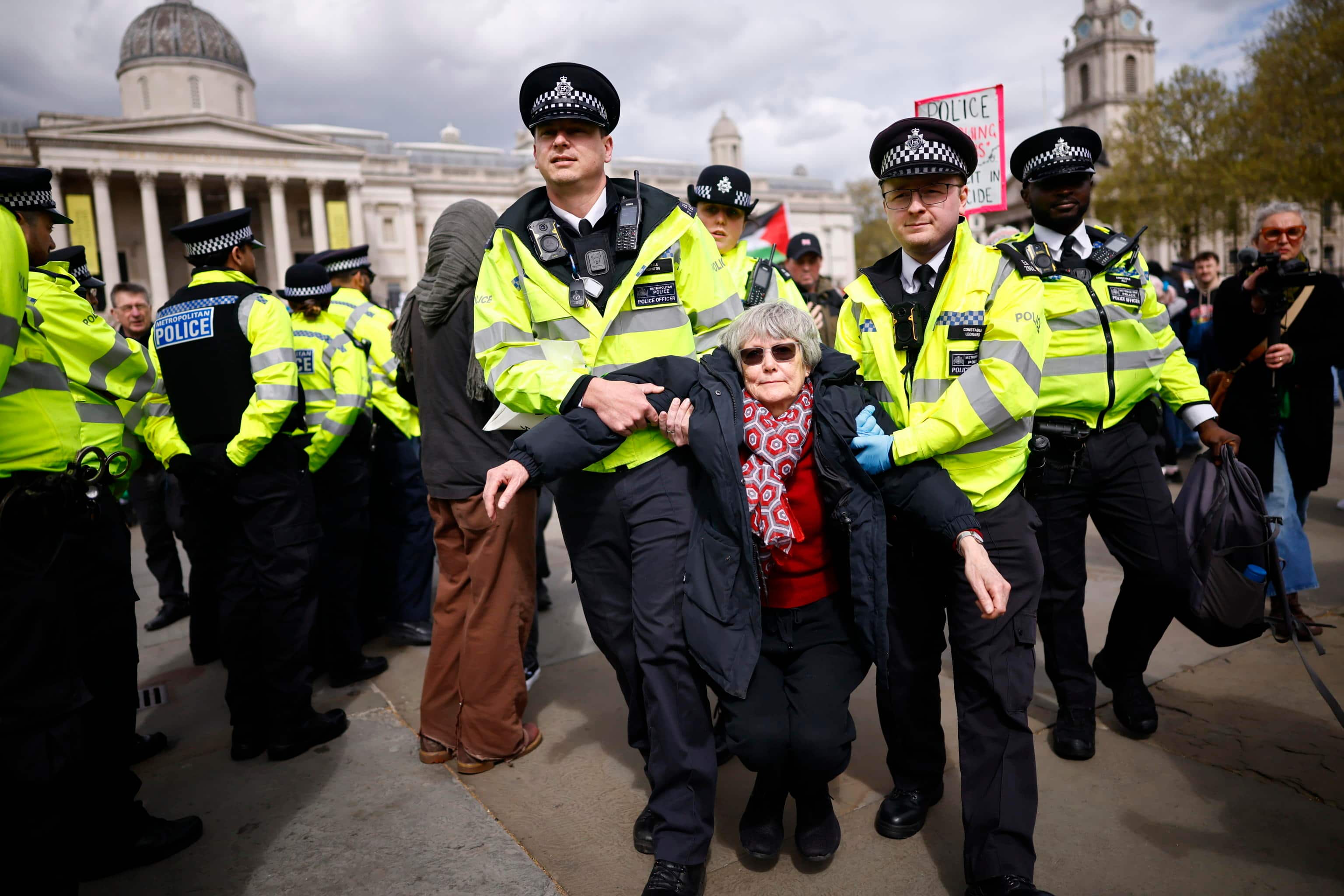 Tra le 300 e le 400 persone si erano riunite ieri a mezzogiorno a Trafalgar Square per una manifestazione silenziosa, una sorta di sit-in pacifico, durante la quale molti esponevano il cartello proibito: "Mi oppongo al genocidio, sostengo Palestine Action"