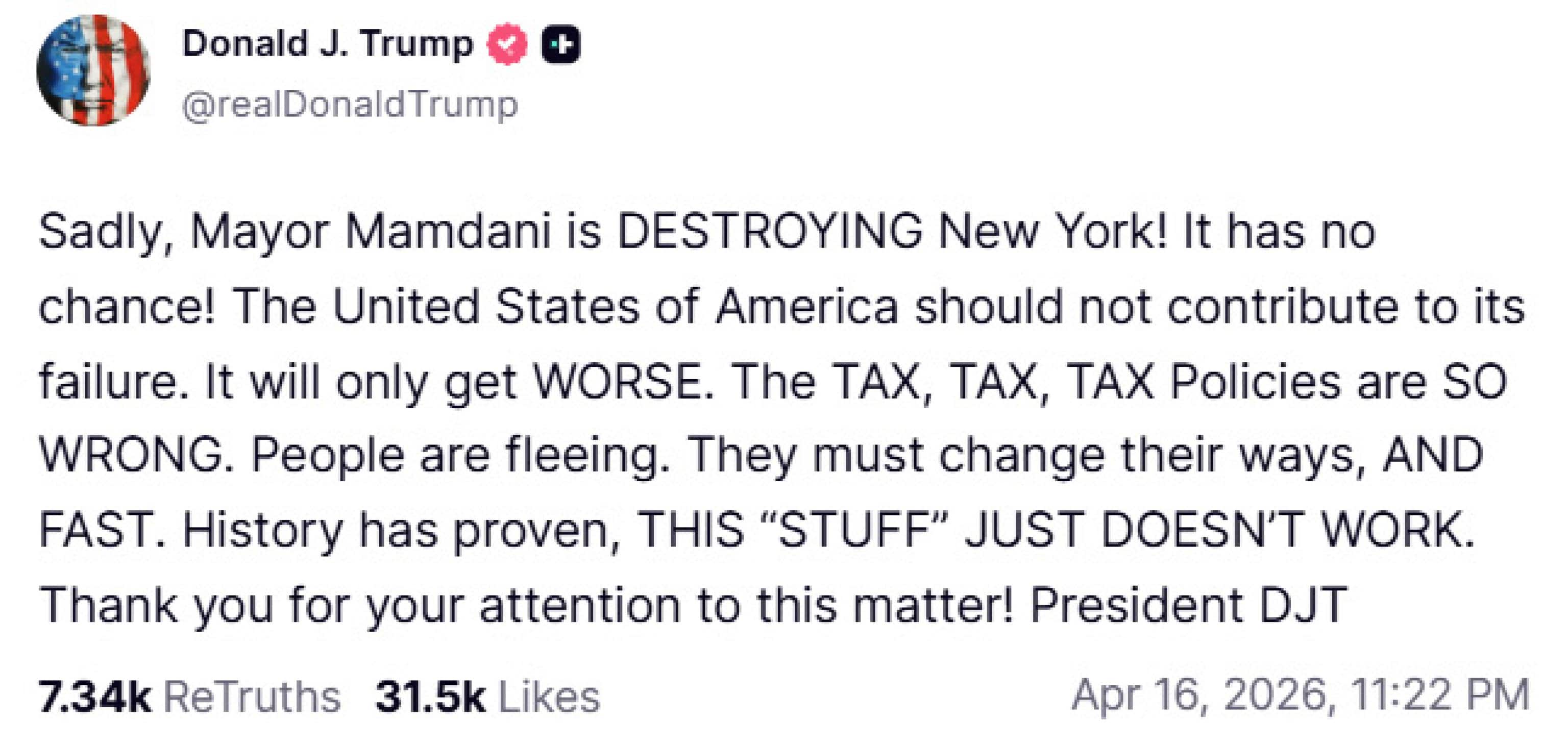 Di parere contrario invece il presidente statunitense Donald Trump che su Truth ha affermato che Zohran Mamdani sta "distruggendo New York". Per il leader della Casa Bianca, la politica delle tasse alte attuata dal sindaco della Grande Mela "è sbagliata: la gente sta scappando. Devono cambiare i loro modi e in fretta. La storia ha dimostrato che questa 'faccenda' semplicemente non funziona".