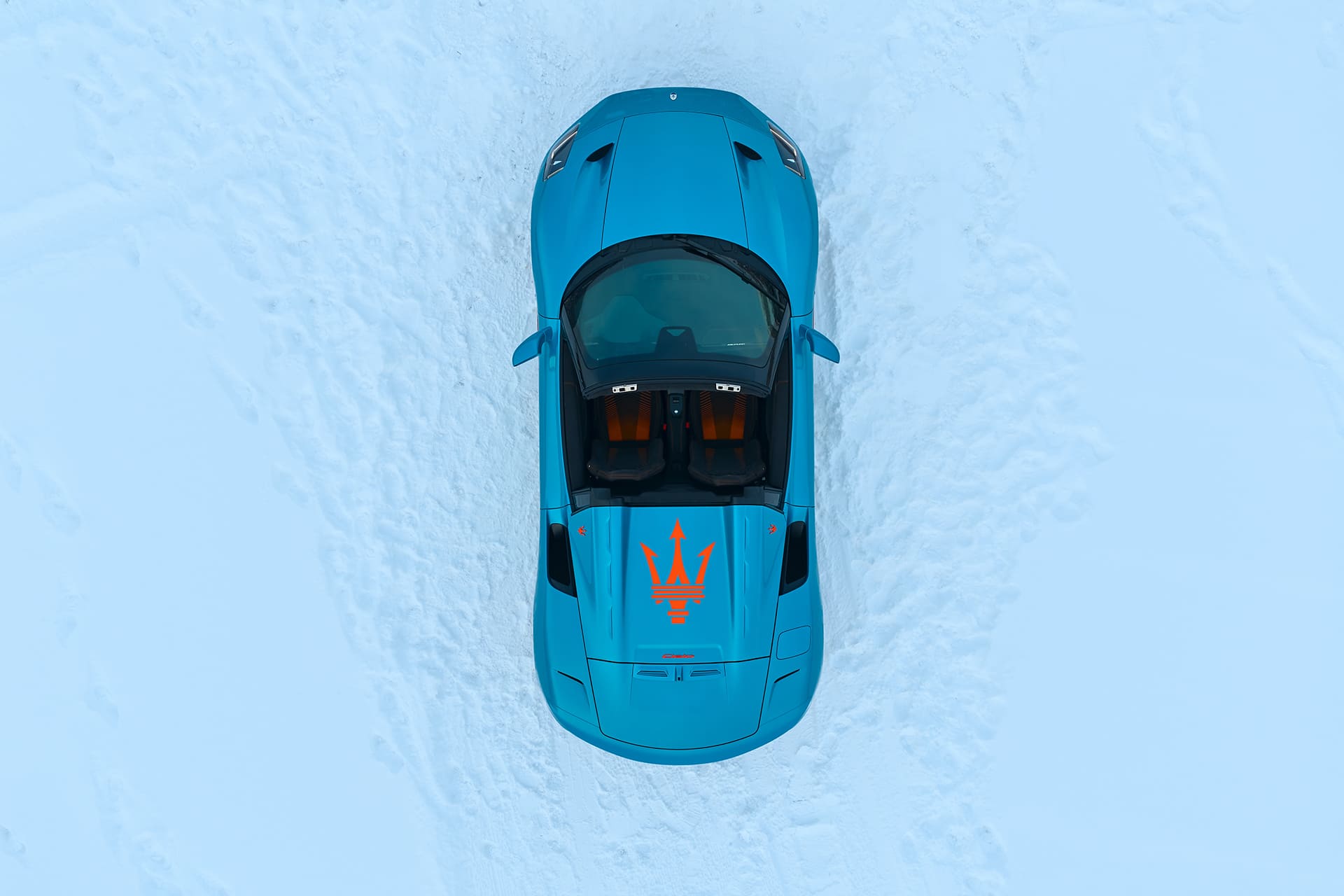 Questo speciale esemplare ha una livrea Aqua Rainbow glossy, una colorazione che cambia colore con la luce richiamando le superfici cristalline del ghiaccio alpino. Qui poi sono stati realizzati alcuni accenti in arancione lucido bespoke che caratterizzano la dreamline laterale, il Tridente sul tonneau cover, i badge esterni, il lettering Maserati e il badge Cielo. I fascioni laterali sono in nero lucido mentre i cerchi da 20’’ con design Cyclonic sono in nero glossy Fuoriserie e nascondono pinze freno arancioni, con coprimozzo e Tridente coordinati.