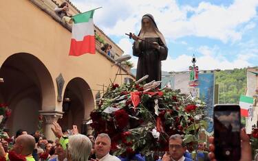 Celebrata a Cascia la festa di Santa Rita. Tanti i devoti che hanno affollato il viale che porta al santuario della statua della santa dei casi "Impossibili". Al passaggio della quale si è consumato il rituale del lancio e della consegna delle rose rosse.