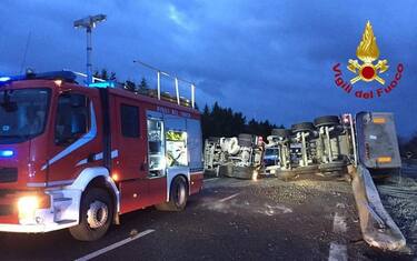 L'autista dell'autocarro è stato trasportato all'ospedale di Perugia. In seguito all'incidente il carico si è disperso su entrambe le carreggiate. (ANSA).