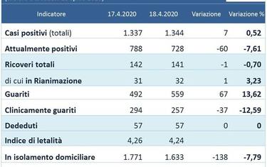 Sono 728, 60 in meno rispetto a ieri. I guariti sono 559