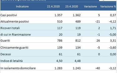 I guariti sono 812 (+ 26) e 134 i clinicamente guariti(- 5); 61 (invariato) i deceduti.
