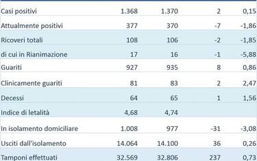 I guariti sono 935 (+8) e 83 i clinicamente guariti (+2); i deceduti sono 65 (+1).