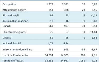 I guariti sono 997 (+34) e 67 i clinicamente guariti (-9); i deceduti sono 66 (+1).
