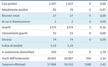 I guariti sono 1.274 (+2) e 15 i clinicamente guariti (invariato).