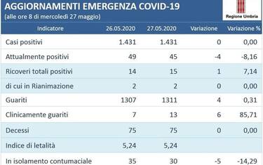(ANSA) - PERUGIA, 27 MAG - Ancora un giorno senza né nuovi casi Covid accertati, 1.431 totali, né nuove vittime, 75, in Umbria. Dove secondo i dati aggiornati dalla Regione gli attualmente positivi scendono a 45 (-4).