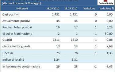 (ANSA) - PERUGIA, 29 MAG - Terzo giorno consecutivo senza nuovi casi di Covid accertati in Umbria dove il dato complessivo rimane a 1.431 (con 1.315 tamponi eseguiti nelle ultime 24 ore) in base ai dati forniti dalla Regione. Si registra però una nuova vittima, 76 complessivamente. Resta un solo paziente ricoverato in rianimazione negli ospedali umbri (ieri erano due).