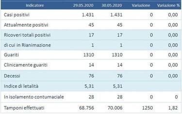 I guariti sono 1.310 (invariato); risultano 14 clinicamente guariti (invariato); i deceduti sono 76 (invariato).