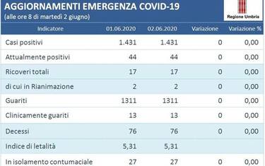 Complessivamente 1.431 persone in Umbria sono risultate positive al virus. Gli attualmente positivi sono 44. I guariti sono 1.311. Risultano 13 clinicamente guariti. I deceduti sono 76.