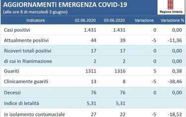 (ANSA) - PERUGIA, 03 GIU - Ancora nessun nuovo positivo in Umbria al Covid19, su 232 tamponi eseguiti, secondo i dati diffusi dalla Regione e aggiornati alle ore 8 di mercoledì 3 giugno: si tratta ormai dell'ottavo giorno consecutivo senza nuovi contagi accertati.