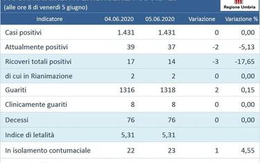(ANSA) - PERUGIA, 05 GIU - Decimo giorno di fila in Umbria senza nuovi casi Covid accertati, 1.431, mentre nelle ultime 24 ore si registrano due nuovi guariti, 1.318 in tutto, che fanno scendere a 37 (-2) gli attualmente positivi. Fermo ancora a 76 il numero dei decessi. E' il quadro che emerge dai dati forniti dalla Regione.