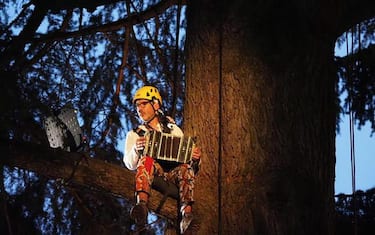 (ANSA) - PERUGIA, 20 LUG - Per fare un albero… ci vogliono artisti pieni di passione e che sanno cosa è la sfida. Musicale e fisica. Seduti su rami robusti e in equilibrio, con caschetti e imbracature per scalare, su un cedro centenario a dodici metri d'altezza. Due straordinari musicisti come Paolo Fresu (tromba, flicorno, effetti) e Daniele di Bonaventura (bandoneon) a suonare in alto quindi, con l'Orchestra da Camera di Perugia invece accanto al grande tronco. Tutto per un pubblico di poco meno di 90 persone in presenza, senza contare chi ha seguito il concerto dallo streaming in diretta. Per sottolineare che dobbiamo mutare il nostro rapporto con l'ambiente. Con la musica, come ha detto Fresu, "che nonostante il distanziamento riesce a farci stare vicini". Doveva essere - l'evento si è svolto domenica sera - il concerto finale di Umbria jazz 2020 (edizione annullata per l'emergenza sanitaria), ma è stata alla fine l'anteprima di "Jazz in August", la quattro giorni (7-10 agosto) in programma a Perugia come alternativa speciale al festival. (ANSA).