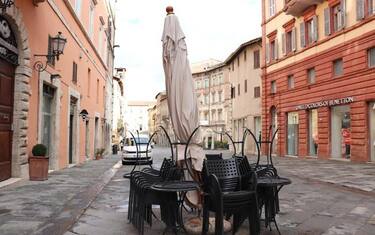 È praticamente deserto il centro storico di Perugia, da oggi "zona rossa" come l'intera provincia e sei comuni di quella di Terni per contenere la diffusione del Covid e delle sue varianti. Da stamani sono così di nuovo chiuse tante attività nel cuore del capoluogo umbro. Tra queste anche diversi bar. In corso Vannucci, il salotto buono di Perugia, si notano soprattutto gli operai al lavoro in un paio di cantieri e gli addetti alla nettezza urbana e qualche mamma a spingere passeggini. A fare da sfondo le sedie accatastate e gli ombrelloni chiusi dei ristoranti e dei vari locali.