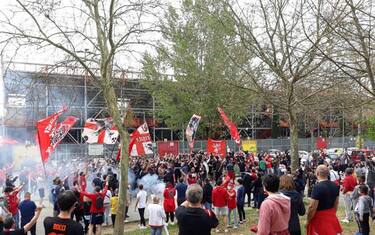 Durante la seduta di rifinitura all'antistadio Curi, tantissimi tifosi si sono ritrovati fuori dagli impianti per supportare i giocatori con cori e bandiere. (ANSA).