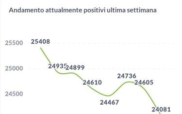 I nuovi casi di positività accertati (in diminuzione rispetto a ieri) sono 1.807. I guariti sono 2.326, i decessi salgono da 1.615 a 1.620. Gli attualmente positivi sono 24.081 (524 in meno in un giorno).