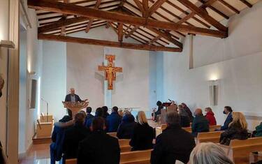 (ANSA) - ASSISI (PERUGIA), 09 MAR - Inaugurata la Sala del Cantico delle Creature di San Damiano, ad Assisi, danneggiata dal sisma e completamente rinnovata da First Social Life, associazione di promozione sociale nata dall'impegno sindacale nella vita delle comunità di First Cisl, con il contributo di Crédit Agricole Italia, in accordo con l'Ordine del Frati Minori. Intervento eseguito nell'ambito del progetto "Rebuild: la fiducia ricostruisce il Paese" nato nel 2017 dall'incontro con padre Giulio Mancini ed è stato seguito negli anni dai padri Giampaolo Masotti, Massimo Reschiglian e Mauro Botti, i Guardiani del Santuario di San Damiano in Assisi succedutisi in questi anni.