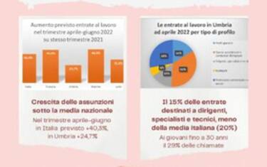 Quanto ai giovani fino a 30 anni, rappresentano una quota del 29% delle chiamate al lavoro. I laureati ad aprile rappresentano nella regione il 10,4% degli assunti confermando il dato storico che vede l'Umbria, in termini di entrate al lavoro dei laureati, stare sotto il dato nazionale (14,6%) di circa un terzo (ma un recupero c'è stato - viene spiegato ancora -, dato che venti anni fa le entrate al lavoro dei laureati, in percentuale sul totale delle assunzioni, erano in Umbria la metà della media italiana).