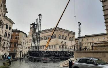 Una gru mobile con un lungo braccio è stata impiegata per sistemare le torri metalliche che sorreggeranno il tetto della struttura. L'area, transennata, si trova tra il duomo, la fontana Maggiore e palazzo dei Priori. Comunque a una distanza considerata di sicurezza dai tre siti. Per evitare danni alla pavimentazione della piazza, il palco viene allestito su una sorta di tappeto in legno. Impegnati ormai da alcuni giorni diversi operai specializzati in questo tipo di interventi.