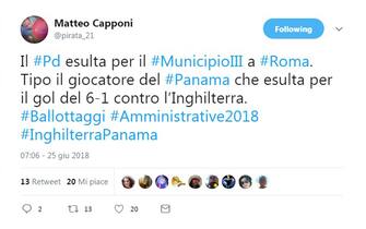 Terminato lo spoglio delle schede per i ballottaggi delle elezioni comunali, le somme si tirano anche su Twitter, senza risparmiare sarcasmo e autocritica. Come l’utente Matteo Capponi, che riesce a trovare un curioso parallelo fra le sorti del Partito democratico e il Mondiale di calcio che si gioca in Russia -