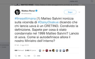 Renzi contro Salvini. Ad accendere il confronto, però, non è una questione politica, ma il lancio di uova all’atleta Daisy Osakue (CHI È). Salvini, sul caso, aveva definito dei cretini i responsabili del gesto. Ma l’ex premier su Twitter ricorda un episodio simile che nel passato ha riguardato proprio il ministro degli Interni: "Matteo Salvini - scrive Renzi - ironizza sulla vicenda di Daisy dicendo che chi lancia uova è un cretino. Condivido la definizione. Sapete per cosa è stato condannato nel 1999 Matteo Salvini? Lancio di uova. Come si autodefinisce allora il nostro ministro dell’interno?".