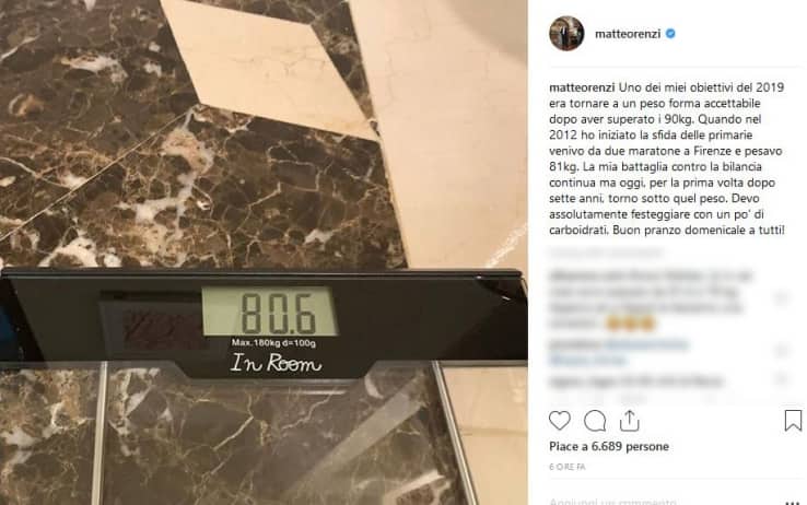 L’ex premier Matteo Renzi festeggia con un post su Instagram la perdita di peso e il ritorno a un peso forma "accettabile": "Uno dei miei obiettivi del 2019 era tornare a un peso forma accettabile dopo aver superato i 90 chili", scrive sul social condividendo una foto della bilancia che segna 80,6 chili. Nel post l’ex segretario del Pd ricorda il peso del 2012 quando veniva da due maratone e pesava 81 chili. E chiude: "Devo assolutamente festeggiare con un po' di carboidrati".