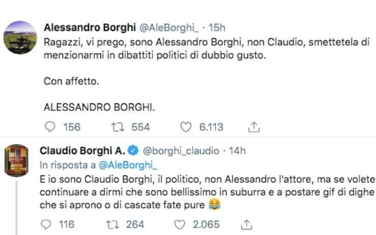 Nei commenti al post di Alessandro Borghi, infatti, a un certo punto è comparso l’intervento del politico leghista che, rivolgendosi agli utenti distratti, ha scritto: “E io sono Claudio Borghi, il politico, non Alessandro l'attore, ma se volete continuare a dirmi che sono bellissimo in Suburra e a postare gif di dighe che si aprono o di cascate fate pure”.