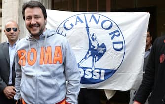 Qui il leader della Lega durante l'apertura di una sezione a Roma nel 2014, con una felpa coi colori che richiamano la squadra giallorossa della capitale