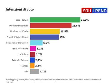 Ultimi sondaggi politici YouTrend per Sky TG24: Lega in testa al 26,2%
