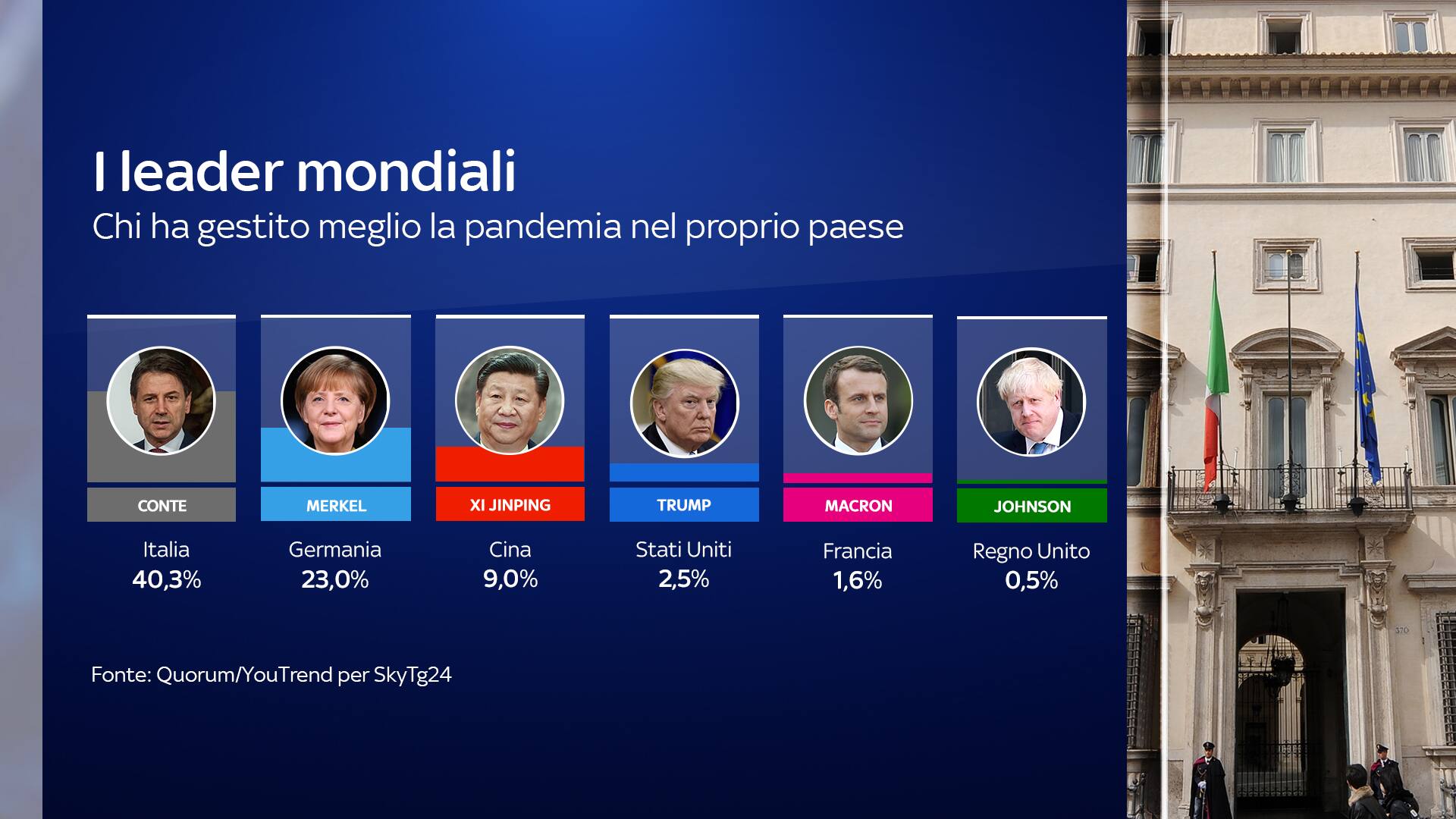 Secondo gli intervistati, il premier Conte è il leader mondiale ad aver gestito meglio la pandemia nel proprio Paese. Il presidente del Consiglio viene indicato dal 40,3% degli intervistati. Segue la cancelliera tedesca Angela Merkel (23%). Nettamente staccati il presidente cinese Xi Jinping (9,0%), l’americano Donald Trump (2,5%), il francese Emmanuel Macron (1,6%) e il premier britannico Boris Johnson (0,5%). Per il 10,9% il leader più efficace non è nessuno dei precedenti, mentre l’11,7% non si esprime.
