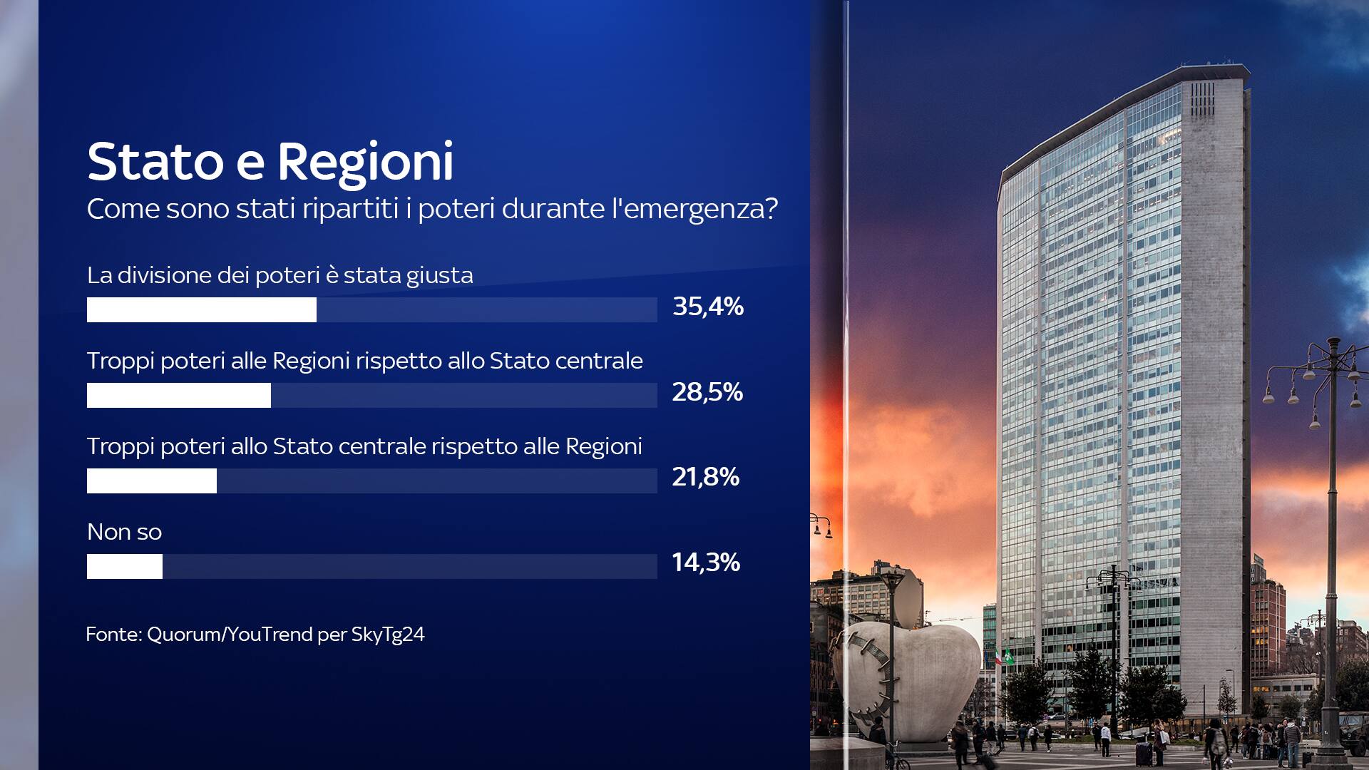 Nella gestione dell’emergenza coronavirus, per la maggior parte degli intervistati, pari al 35,4% non c’è stato squilibrio tra Stato e Regioni nella divisione dei poteri. Le Regioni hanno avuto troppi poteri rispetto allo Stato centrale per 28,5% del campione, contro il 21,8% che ritiene che lo Stato centrale abbia avuto troppi poteri rispetto alle Regioni. Non esprime un giudizio il 14,3%.