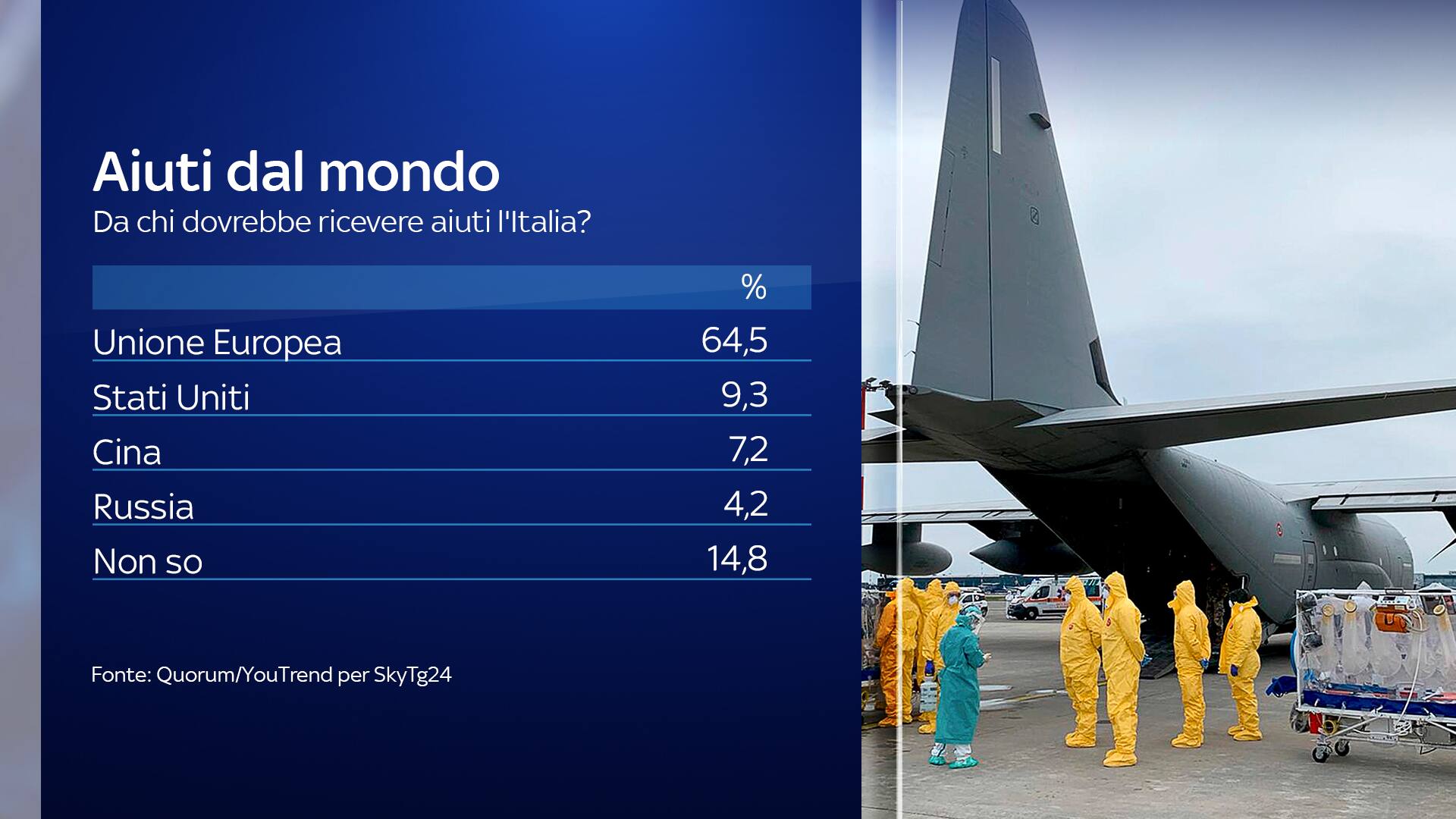 In merito alla ricerca di aiuti da Stati o organizzazioni internazionali, per il 64,5% degli intervistati l’Italia dovrebbe cercare aiuto in Unione Europea (IL RECOVERY FUND DA 750 MLD DELL'UE). Seguono gli Stati Uniti (9,3%), la Cina (7,2%) e la Russia (4,2%), mentre non esprime un’opinione il 14,8% del campione.