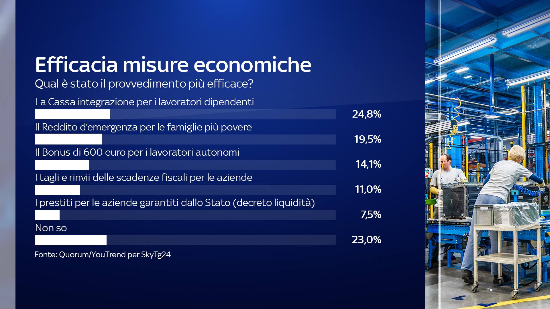 Per quanto riguarda il governo, il 52,9% ha fiducia nell’attuale esecutivo. Il 70,8% ritiene abbastanza o molto positivo l’operato sul fronte della tutela della salute e della protezione dei cittadini dal virus. Maggioranza negativa (53,3%) invece sulle misure per l’economia. Tra i provvedimenti ritenuti più efficaci la cassa integrazione (24,8%), il reddito d’emergenza (19,5%) e il bonus di 600 euro per i lavoratori autonomi (14,1%).