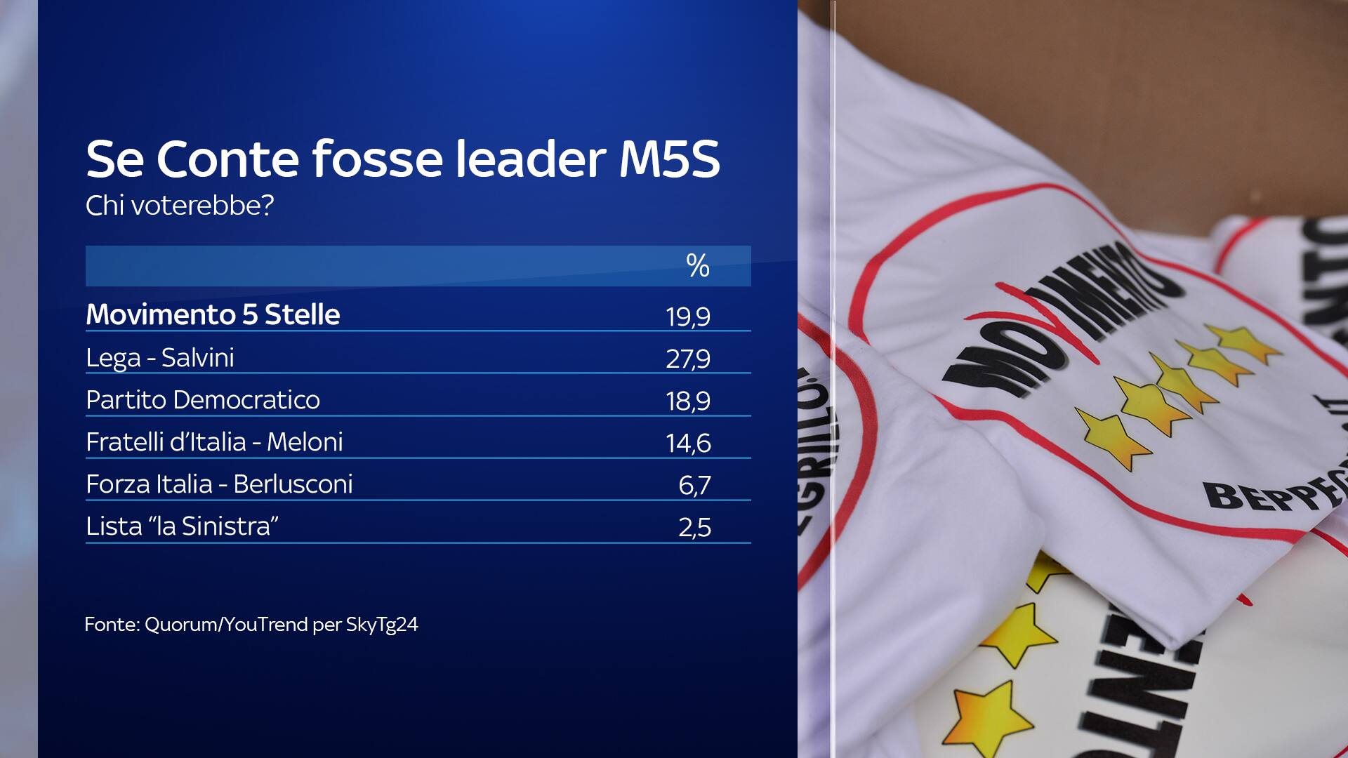 Queste invece le intenzioni di voto qualora il premier Giuseppe Conte fosse il leader del M5S: indecisi e astenuti sarebbero il 53,5%, mentre tra chi esprime una preferenza la Lega sarebbe primo partito al 27,9%, seguita dal Movimento 5 Stelle – Conte al 19,9%, il Partito Democratico al 18,9%, Fratelli d’Italia al 14,6%, Forza Italia al 6,7%, La Sinistra al 2,5%, Azione! al 2,2%, Italia Viva al 2,1%, +Europa al 1,6%, Cambiamo al 0,9%, mentre sceglierebbe un altro partito il 2,7%.